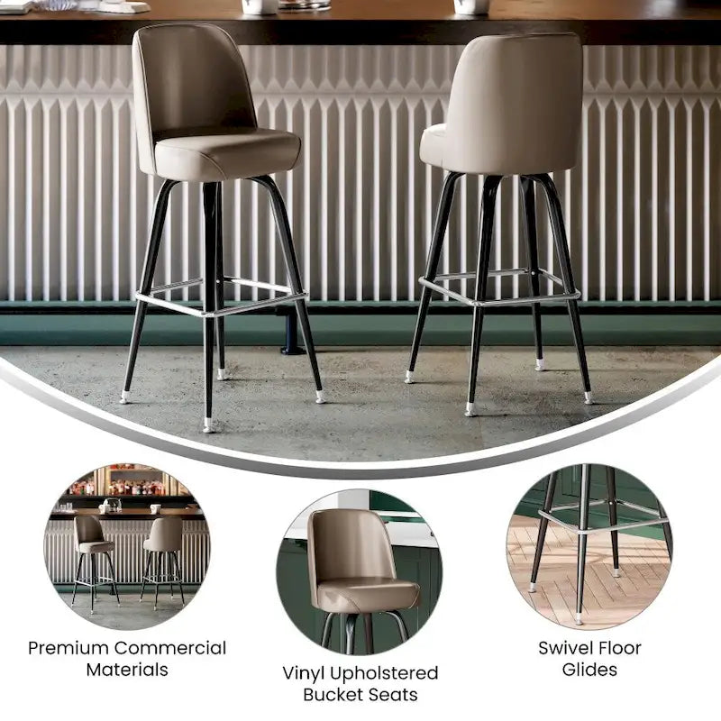 Commercial furniture needs to be both durable and low maintenance so metal barstools are a popular choice for furnishing restaurants, pool halls, lounges, bars and other high traffic establishments. This stool is easy to clean, which is an important aspect when it comes to a business. Add seating to your home bar or furnish the bar in your hotel with these durable upholstered stools. The contoured bucket seat envelopes the user in comfort. The tubular footrest not only supports your feet, but acts as additional reinforcement to help secure the legs. The swivel floor glides help protect your floors and ensure smooth gliding. Use this bar height stool in your kitchen, dining room or home bar and give your decor a fresh look.