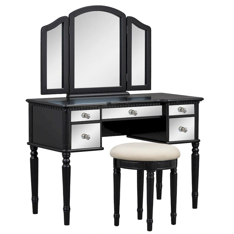 French-Inspired: The drawer surface of this dressing table is also designed with mirror surfaces, which blends high-end modern style with elegant French style, immering yourself in it.Triple Mirror Design: The dressing table comes with a tri-fold mirror, with adjustable side mirrors that can be rotated to your desired angle, allowing you to achieve the perfect view from every angle.Spacious Storage: The table boasts five drawers, with the top three small drawers lined with velvet to protect your precious jewelry and prevent scratches. The two larger drawers offer ample space for storing a variety of items.Plush Upholstered Stool: The accompanying stool features an ultra-soft cushioned seat, providing comfort and style for you.