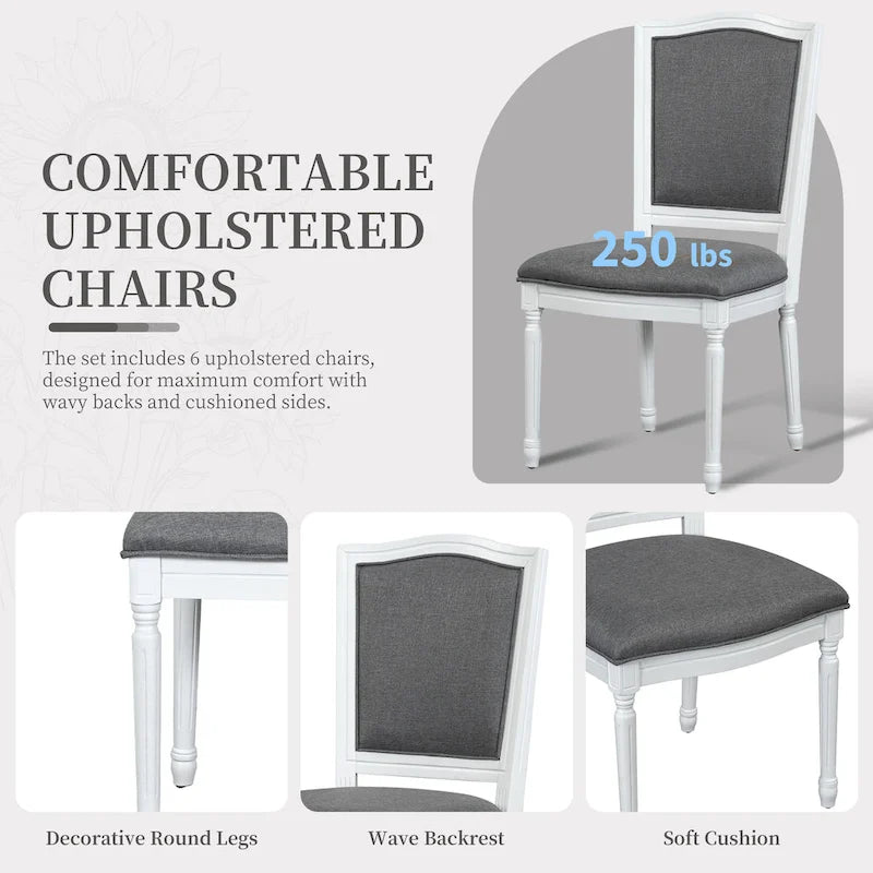 This 7-piece dining set offers a perfect combination of durability and style, crafted from high-quality solid rubber wood. The table features an extendable design with an 18-inch removable leaf, offering flexible seating arrangements for both small andlarge gatherings. Six upholstered chairs provide comfort and support, while built-in drawers add convenient storage for your dining essentials.