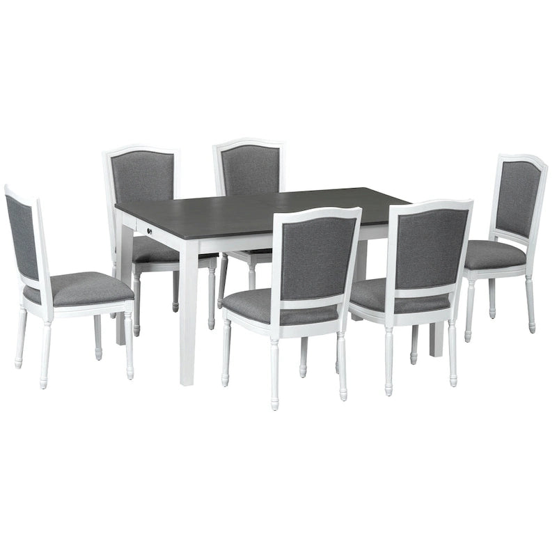 7 Pcs Dining Table Set, Solid Wood Table and Chairs Set with Extendable Dining Table, 2 Drawers and 6 Upholstered Chairs