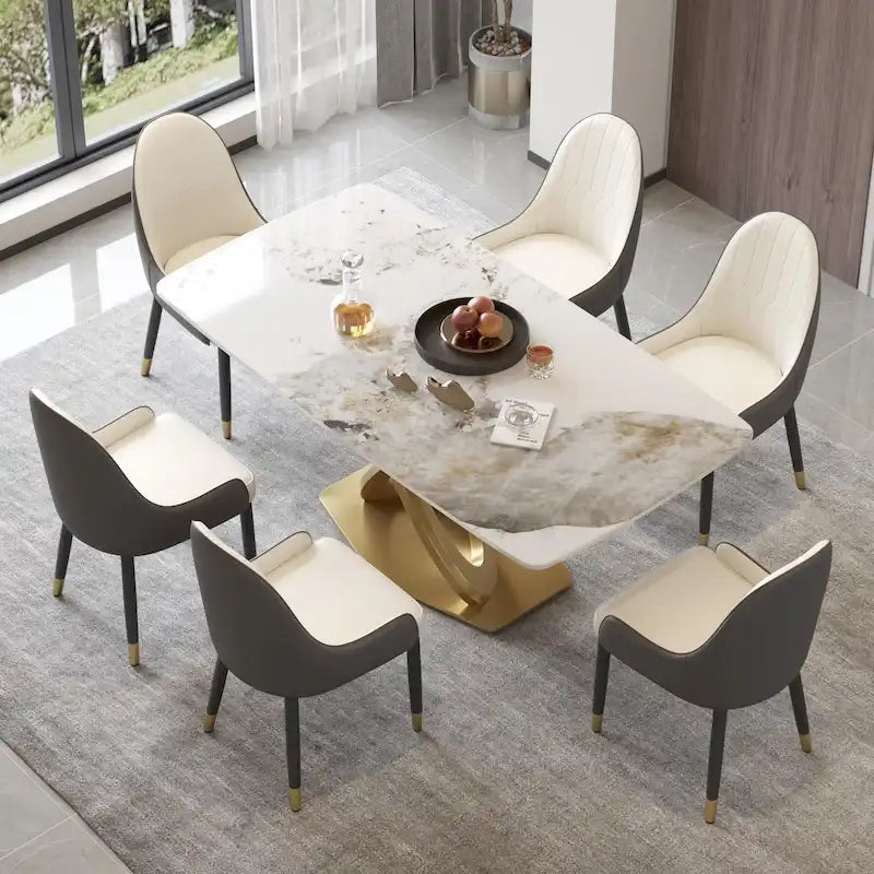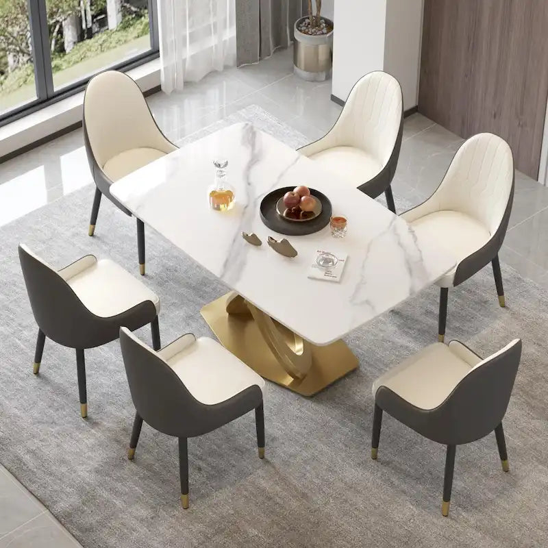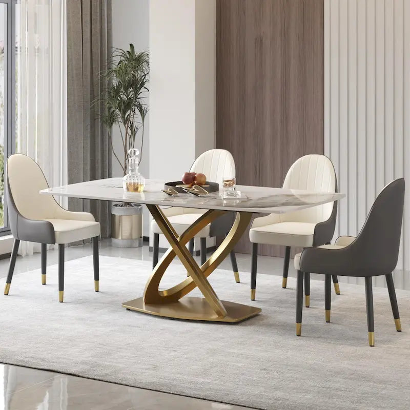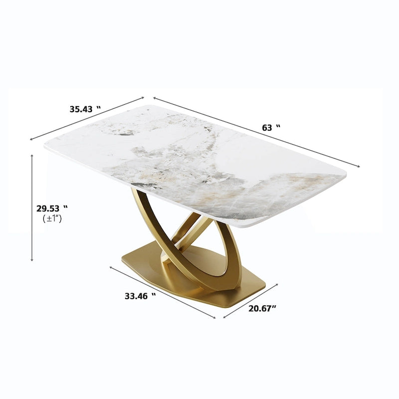 Enhance your dining room atmosphere with this Contemporary Marble Dining Table with Gold Geometric Base. Sturdy sintered stone table top with solid stainless steel pedestal, ensurring the durability and stability for longivity. You can believe that this uniquely designed dining table will add a modern touch to your restaurant, and it will perfectly match the decoration style of the restaurant. At the same time, this dining table will become a good helper for you to dine or entertain.