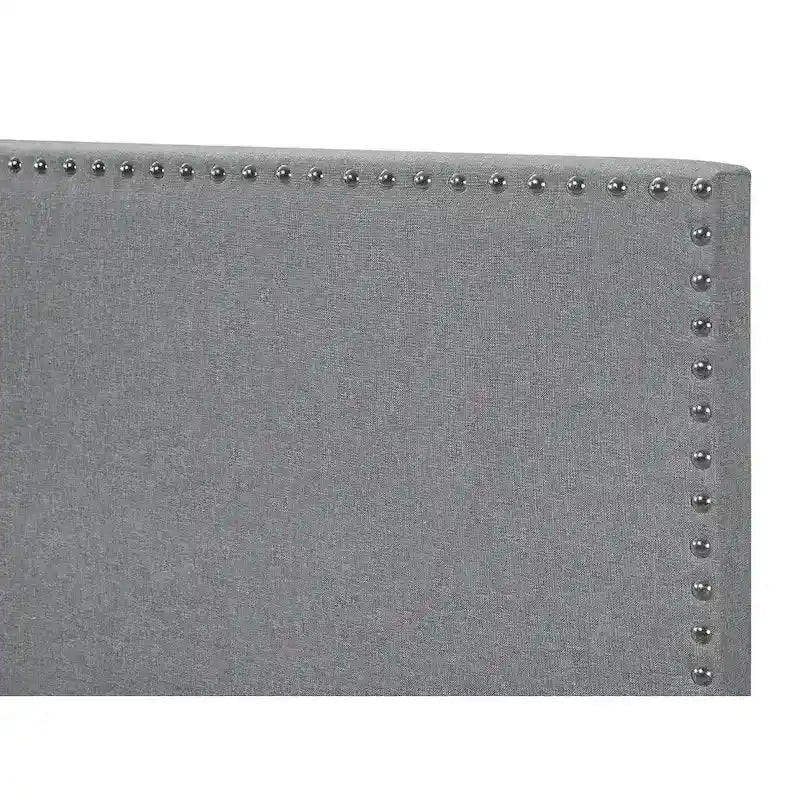 Experience modern sophistication with the Copper Grove Aubagne upholstered panel bed. Featuring a solid wood frame, this contemporary bed is upholstered in grey polyester and accented with silver nailhead trim for a touch of elegance. Available in four sizes, this bed includes side rails and slats but requires a box spring and assembly. Elevate your bedroom decor with the Aubagne panel bed.