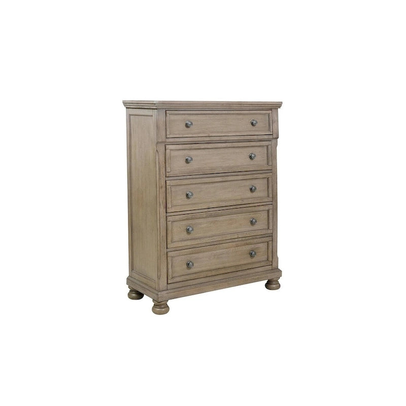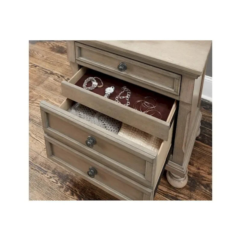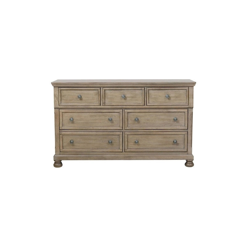 An updated classic addition for your transitional bedroom is the Donald Collection. Traditional accents, such as, turned bun feet that support each piece, and a gray, lightly wire-brushed finish on birch veneer and selected hardwoods, blends with framing and lines that complement your personal style. Hidden drawer storages in the nightstand and dresser are a clever way to hide your valuables. Antique white finish is also available.