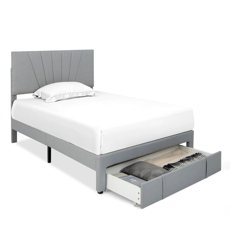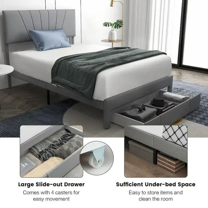 The upholstered bed frame meets your daily needs for sleep and storage. Supported by solid wooden slats, the platform bed is Sturdy for a long lifespan. More, the extra middle support legs highly improve its overall stability. Considering convenient storage, the pull-out drawer and sufficient under-bed space facilitate the placement of clothes, bedding and other sundries. The headboard combines soft sponge filling and Sturdy linen fabric surface for pleasant using experience and can be adjusted to 2 different heights for different needs. All in all, the slatted bed base has an outstanding look and shows your great taste, which offers you a comfortable sleeping environment with reliable quality!