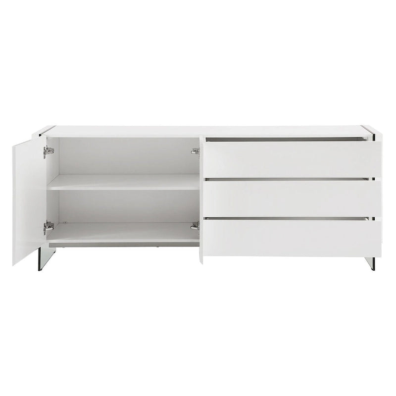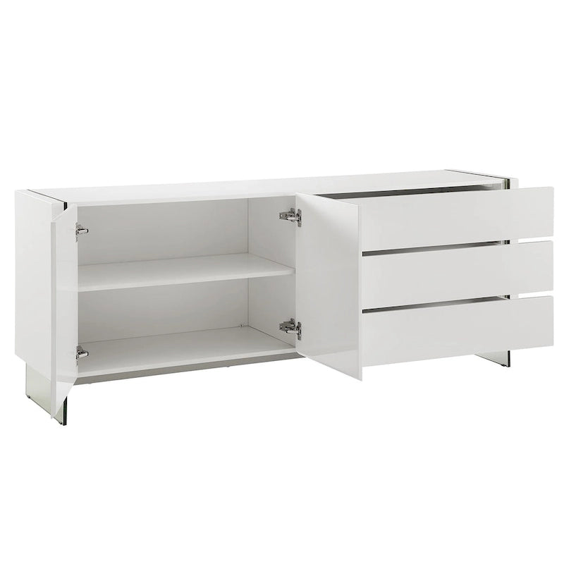 Upgrade your dining space with the sleek and modern IL VETRO buffet-server from Casabianca Home. The high gloss white lacquer finish and clear glass doors add sophistication and edge to any room, while the top commercial-grade materials and soft-closing mechanisms ensure exceptional quality and longevity.
