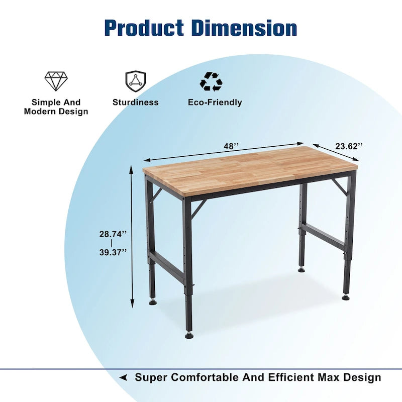 Built for strength and versatility, this adjustable-height workbench features a durable 48 rubber wood top and sturdy steel legs. With a 2000 lb weight capacity and adjustable height range from 28.74 to 39.37, it's ideal for garages, workshops, or home useoffering comfort whether seated or standing.