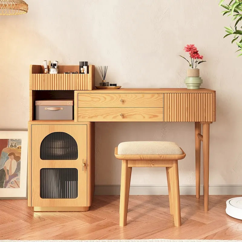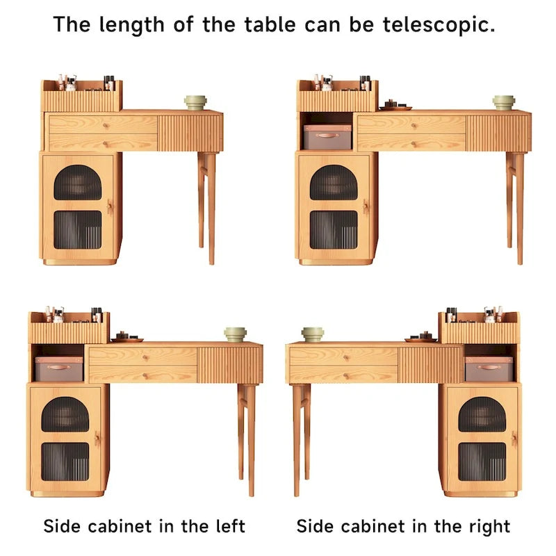 Simplify your morning routine with the JASIWAY Vanity Makeup Table. The wide desktop offers plenty of space to organize your makeup and skincare products. Equipped with three drawers, it provides ample storage to keep your items organized and out of sight. Its sturdy wooden structure ensures reliability for everyday use, while the telescopic design allows for left or right-free installation. This makeup table makes for a wonderful gift on special occasions. Please note that the mirror and stool are not included.