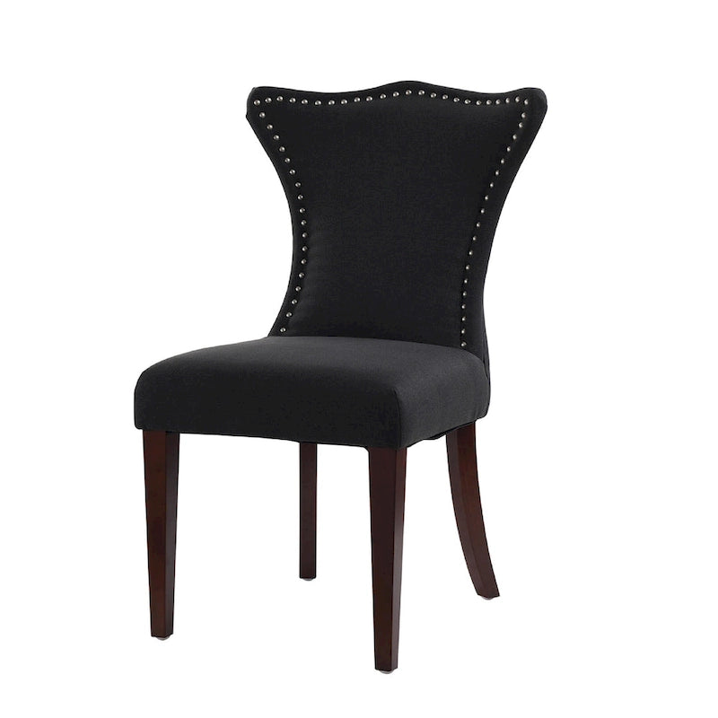 The elegant design of this gorgeous armless dining chair will complement your traditional dining room beautifully with its curved back and brown wooden legs. This classic dining chair features a paradise flower print and is accented by a silver nailhead trim.