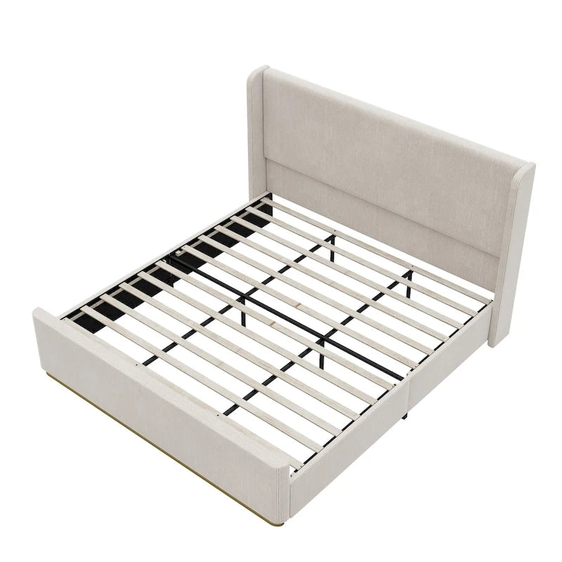 Elevate your bedroom with this luxurious king-size bed featuring a 47 wingback headboard upholstered in premium vertical-striped corduroy. Combining sophisticated design with robust construction, this bed offers 600 lbs of sturdy support while eliminating the need for a box spring.