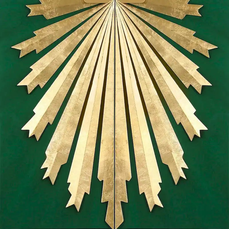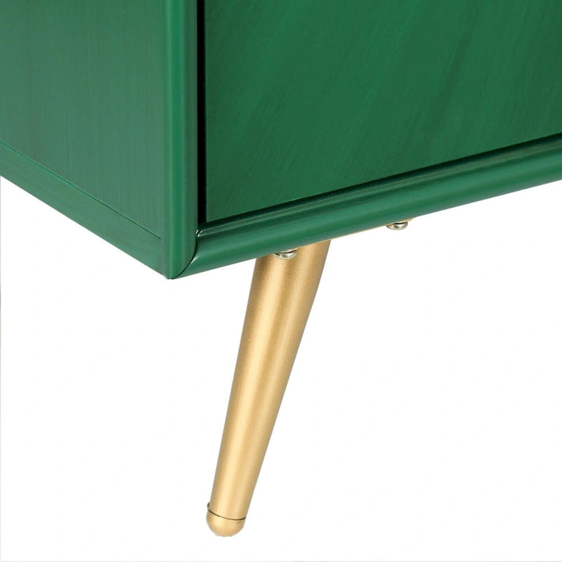 Add some retro charm to your home with this solid wood credenza cabinet featuring a sunburst accent design. The elegant green veneer and metal starburst doors make it a stylish choice for any room. With soft-closing doors and fixed shelves, this cabinet offers ample storage while taking up minimal space.