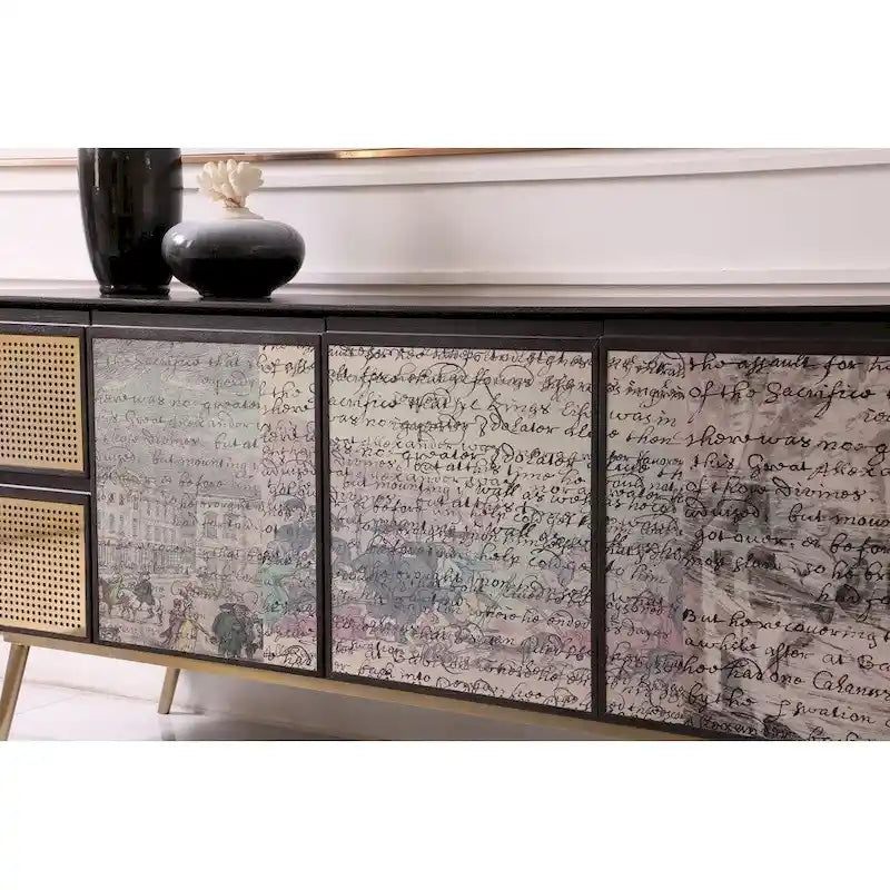 The Phelan Buffet is a modern bohemian style buffet with engaging finishes. The two soft closing drawers are adorned with a gold cane look gold panel inset into its face that adds a glamorous touch to this exciting piece. The three cabinet doors are faced with a multicolored art piece, inspired by a handwritten letter. A gold base with tapered legs and a smoked ash surround finishes this unique piece.
