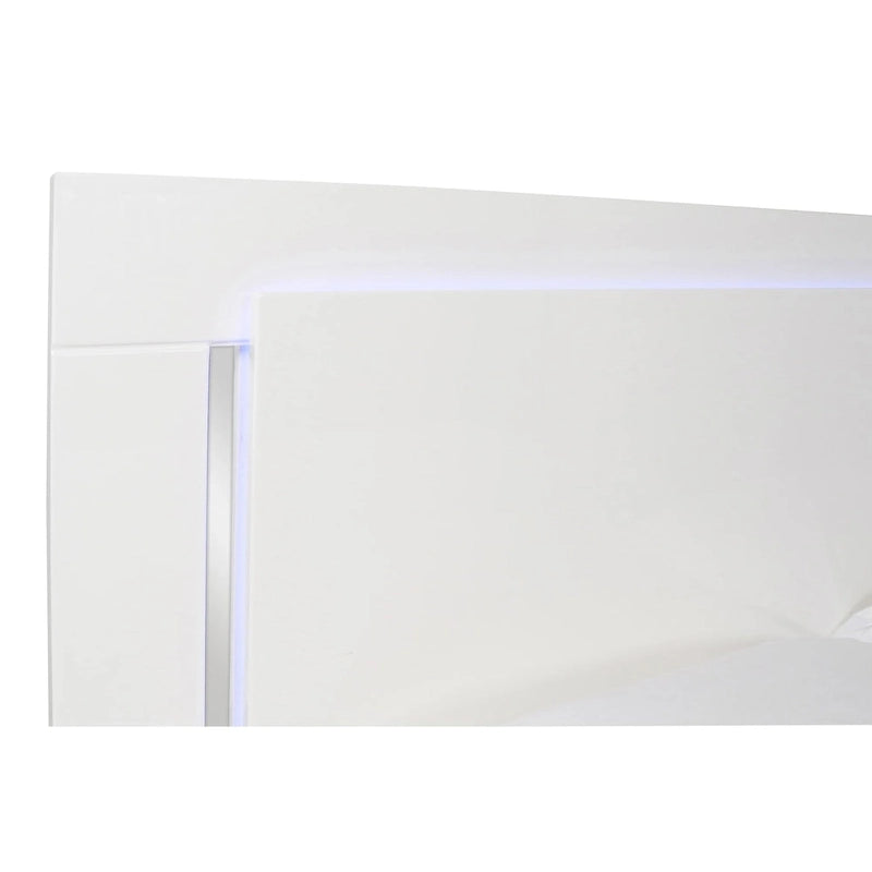A glossy white finish is accentuated with built-in lighting featured in the headboard and base of the bed that centers this modern four-piece bedroom set. Included with the bed are a nightstand, dresser and framed mirror, with dovetail drawers and chic silver-toned pulls and feet that complete the look..