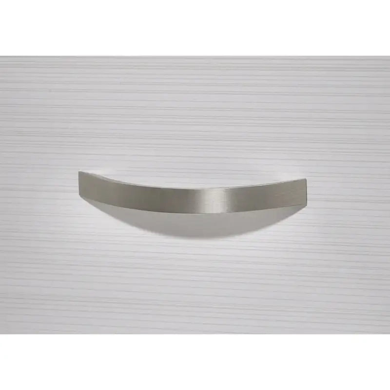 - Chic, modern white finish with a delicate wood grain pattern. Drawers operate easily on metal guides underneath and curved metal bar pulls in a brushed nickel finish