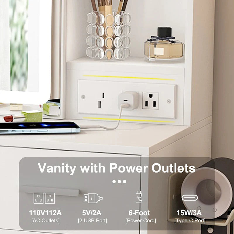 Convenient Power Integration Equipped with 2 USB ports,2 AC outlets on the side panel and a hair dryer stand,allowing simultaneous charging of devices while using beauty tools like hair straighteners or curlers.