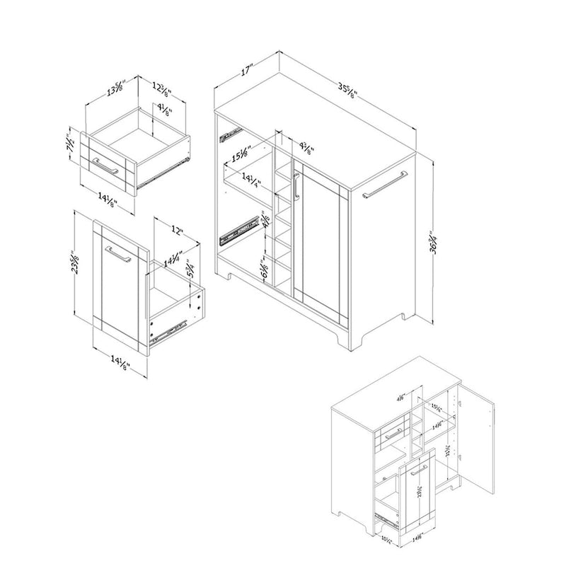 Entertain in style with the South Shore Vietti Bar Cabinet, featuring ample storage for your favorite spirits and glassware. The six-bottle middle rack and sliding storage compartment with adjustable shelf can accommodate up to 12 tall liquor bottles, while the built-in rack and adjustable shelf behind the door can hold up to 8 glasses of different heights. A spill-proof tray, towel holder, and deep drawer for small accessories make entertaining a breeze. With its elegant metal handles and vinyl-coated top tray, this bar cabinet is both functional and stylish.
