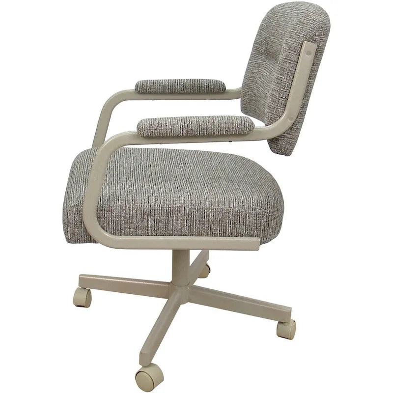 This compact size Upholstered Dining Chair offers tremendous comfort with a contemporary look. Featuring a swivel caster chair with a powder coated metal frame. Custom upholstered seat and back that is perfect for indoor use. All welded frame without any bolts. Will accommodate any dinette table.