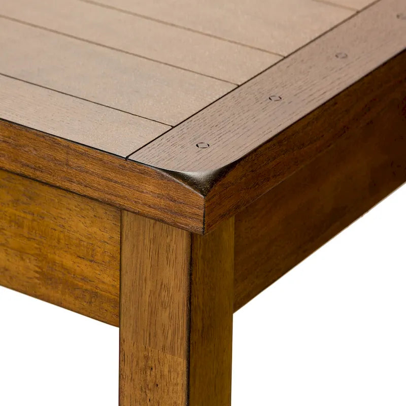 Design possibilities are endless with the Treasures five-piece rectangular table set. Crafted of rubberwood solids and oak veneers, this set features a rustic oak finish and includes the leg table and four sheaf back side chairs. The table has a fixed planked top with wood peg accents and tapered legs. The chairs have saddle shaped seats for added comfort and an H shaped stretcher for extra support as well as nylon chair glides to protect your flooring. Treasures offers simple shaker styled dining in a subtle finish which evokes the feel of a treasured antique.