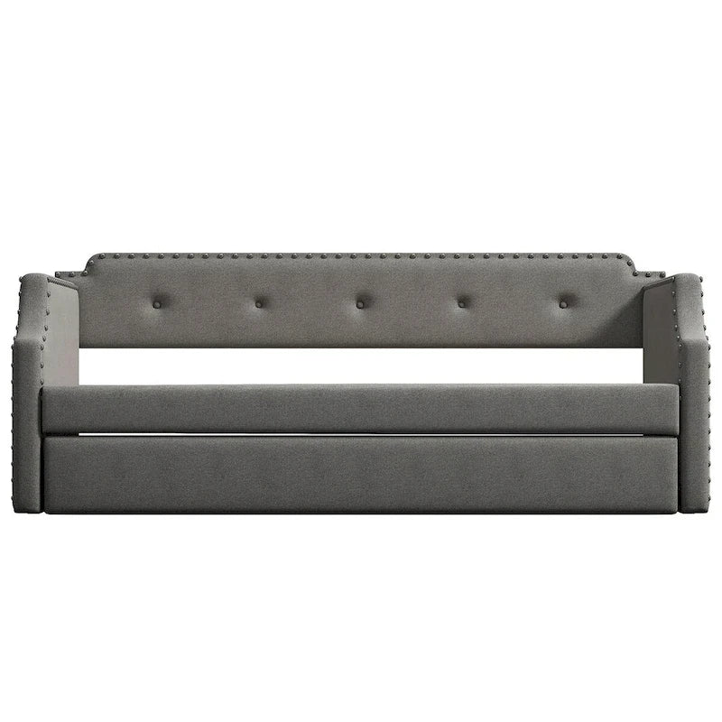- [Upholstered Daybed] Elegant style Upholstered in carefully-selected linen fabric, features two armrests, this daybed with trundle not only suits any home dcor, but is timeless in its design. The soft textile bedhead creates coziness, while the single color of the design creates versatility.